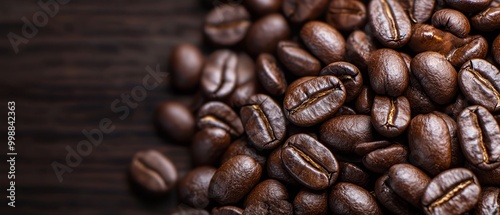 © Janis, Fototapeta premium A wood table holds a mug of coffee and a stack of roasted beans