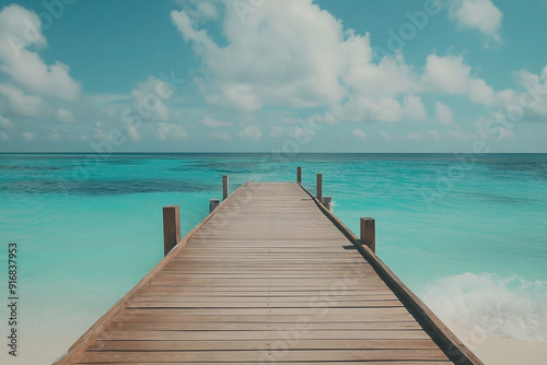 © zuhri, Obraz premium A wooden beach pier leading into turquoise water of the maldives. Maldives on a tropical beach scene
