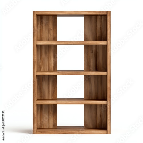 © padungsak, Obraz premium A wooden bookshelf with five shelves, featuring a minimalist design and a natural finish, suitable for organizing books and decorative items.