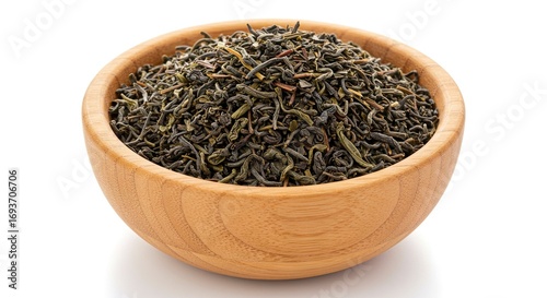Fototapeta premium A wooden bowl brimming with curled dark green tea leaves sits on a white...