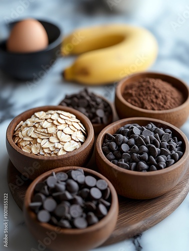 © asier, Obraz premium A wooden bowl filled with chocolate chips sits on a marble countertop