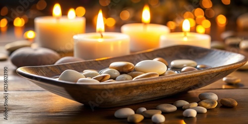© kavalin, Obraz premium A wooden bowl filled with smooth stones and water, surrounded by candles and bathed in warm, golden light.