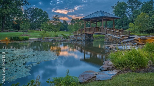 Fototapeta premium A Wooden Bridge Connects Over A Reflective Pond At Dusk
