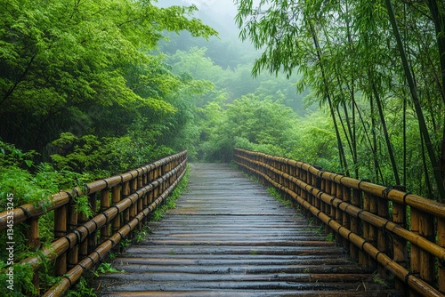 © Jumaria, Obraz premium A Wooden Bridge Extends Through Lush Green Vegetation In A Forest