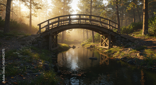 Fototapeta premium A wooden bridge over a stream in a forest with sunlight shining through the...