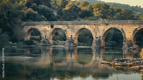 Fototapeta premium A wooden bridge spanning a serene lake or river, surrounded by lush greenery...