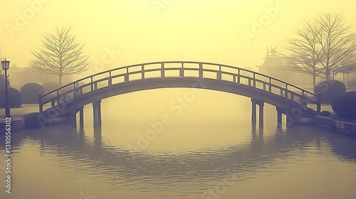 © Rezeki, Naklejka premium A Wooden Bridge Spans a Foggy Canal in a Tranquil Scene