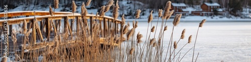 Fototapeta premium A wooden bridge spans a frozen lake, surrounded by a forest
