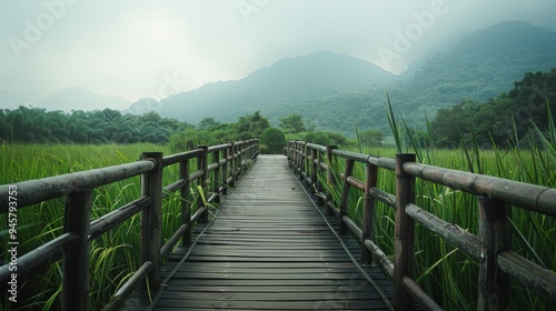 Fototapeta premium A wooden bridge stretches into a misty green landscape with mountains in the distance, evoking a sense of serenity and exploration.