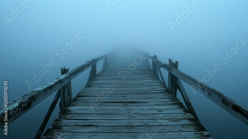 Fototapeta premium A wooden bridge stretches into the dense mist, disappearing into the unknown,...