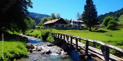 Fototapeta premium A wooden bridge to an old house over a stream with scenery mountains on a...