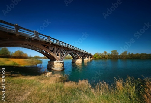 © YiuCheung, Fototapeta premium A wooden bridge with a stone foundation spanning a river under a clear blue sky.