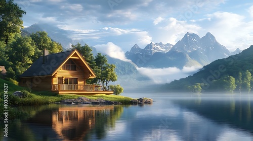 Fototapeta premium A wooden cabin sits on the edge of a tranquil lake in a mountainous landscape, with fog rising from the water.