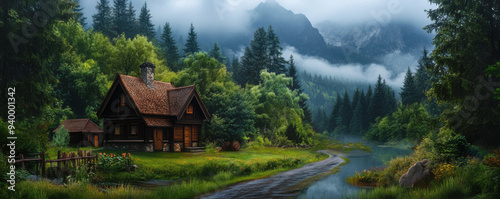 Fototapeta premium A wooden cabin with a red roof is nestled by a tranquil river, surrounded by lush green forest and misty mountains.