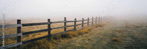 © lastfurianec, Fototapeta premium A wooden cattle fence in a fog-covered meadow with yellowed grass. The fence is made of wooden posts and slats. A banner with space for the text.