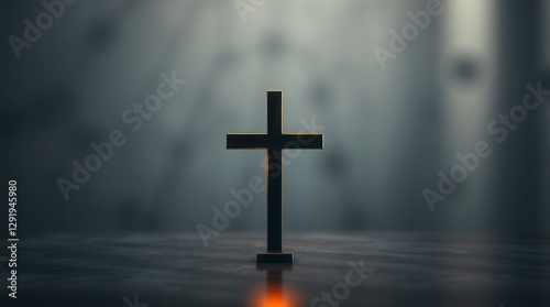 © Vlad, Naklejka premium A wooden Christian cross stands illuminated by soft light against a dark, ethereal background.