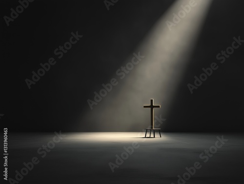 Naklejka premium A wooden cross is sitting on a stool in a dark room