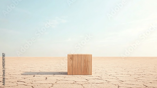 © Napapat Darasuwankul, Fototapeta premium A wooden cube on cracked desert ground under a clear sky, symbolizing isolation and simplicity in a barren landscape.