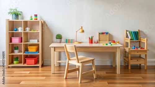 Fototapeta premium A wooden desk with a chair and educational toys arranged around it in an...
