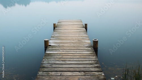 © Dara, Naklejka premium A wooden dock extending into a calm lake with a wooden pier and a wooden post in the water.
