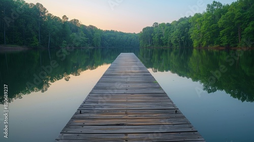 © Usman, Obraz premium A wooden dock extending into a calm lake with no boats.