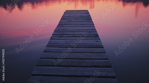 © kept, Obraz premium A wooden dock extending over calm water during a vibrant sunset.