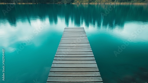 © Максим Фокин, Fototapeta premium A wooden dock extends into a calm turquoise lake, mirroring nearby trees in tranquility