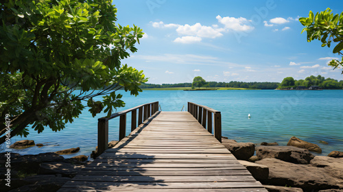 Naklejka premium a wooden dock on a calm lake with trees in the background.