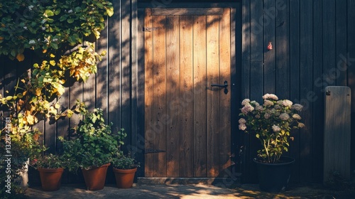 Fototapeta premium A wooden door surrounded by lush greenery and plants outside
