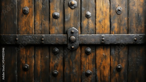 Fototapeta premium A wooden door with a metal latch and a metal bolt