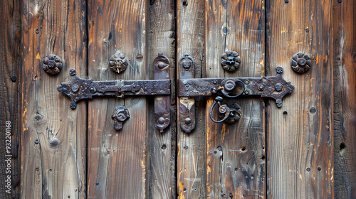 Fototapeta premium A wooden door with ornate metal hinges and handles.