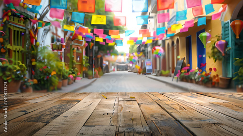 Fototapeta premium A wooden empty tabletop adorned with festive garlands and flags.