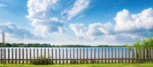 © Ilgun, Naklejka premium A wooden fence stands by the river against a backdrop of a sunny blue sky with fluffy clouds providing a charming scene with copy space image