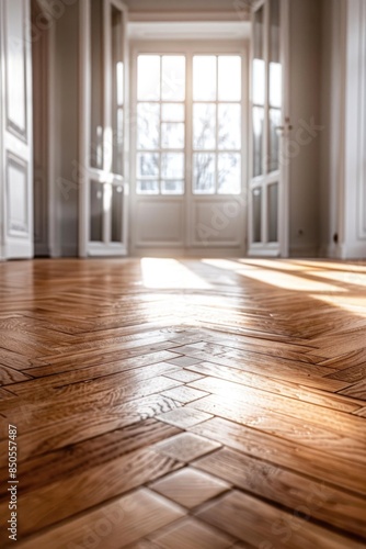 © Fotograf, Obraz premium A wooden floor in a room with a door