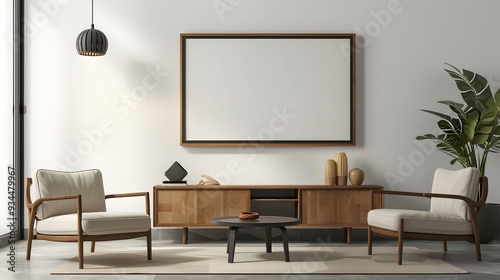 © ArtStage, Obraz premium A wooden frame encapsulates a minimalistic cinema poster in a contemporary room setting AI generated illustration