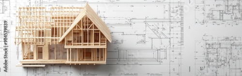 Obraz premium A wooden frame house model is being constructed next to architectural...