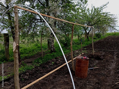 © Олег Струс, Fototapeta premium A wooden frame that supports pipes over which polyethylene film will be stretched to create a greenhouse in your own garden with your own hands from materials at hand. Frame of a greenhouse for growin