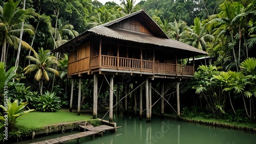 Fototapeta premium A wooden house on stilts sits amongst lush greenery, overlooking a calm, green pond.