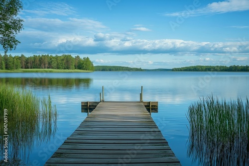 Naklejka premium A wooden jetty extends into a tranquil lake under partly cloudy skies,...
