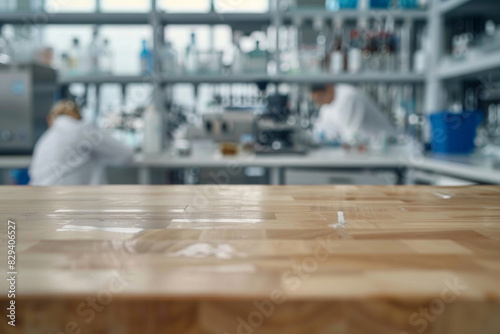 Obraz premium A wooden lab bench in the foreground with a blurred background of a science laboratory. The background features scientific equipment, lab coats, researchers conducting experiments, and shelves.