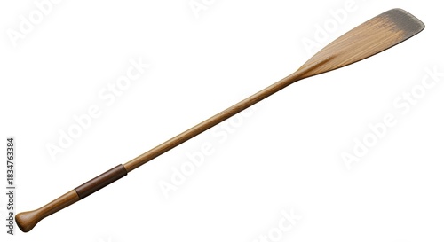 © Dara, Fototapeta premium A wooden paddle with a brown handle and a wooden shaft, lying horizontally on a white background.