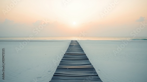 Fototapeta premium A Wooden Pathway Leads to the Horizon Across a Pristine Beach Under a Clear, Pale Sky