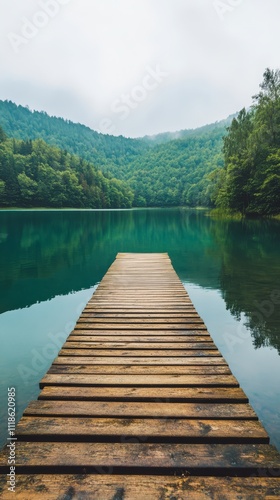 Fototapeta premium A Wooden Pathway to Serenity: A solitary wooden pier extends into a tranquil, mist-shrouded lake surrounded by verdant hills, inviting viewers to find peace and solace in nature's embrace.