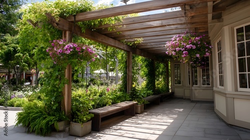 Fototapeta premium A wooden pergola covered in lush green vines and hanging pink flowers offers a shaded tranquil pathway with benches