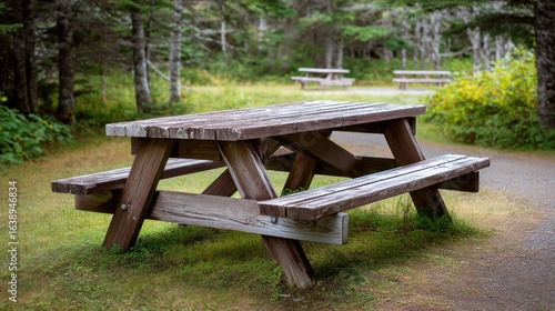 © Dara, Naklejka premium A wooden picnic table in a forested area with a path leading away from it.