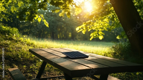 Naklejka premium A wooden picnic table under trees, a solar panel charging a smartphone, with soft sunlight filtering through leafy branches.