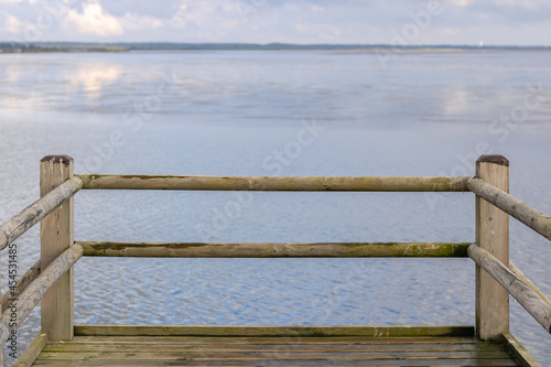 Obraz premium A wooden pier by a river, pond, lake with blue shiny water. Location for...