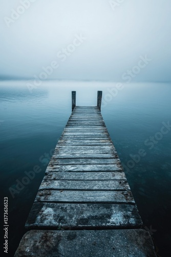© Alexander Chaykin, Fototapeta premium A wooden pier extends into a calm, mist-shrouded lake under an overcast sky.
