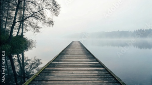 Fototapeta premium A wooden pier extends into a calm, misty lake on a quiet morning