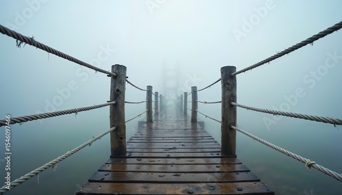 Fototapeta premium A wooden pier extends into a foggy lake. The scene is tranquil with mist...
